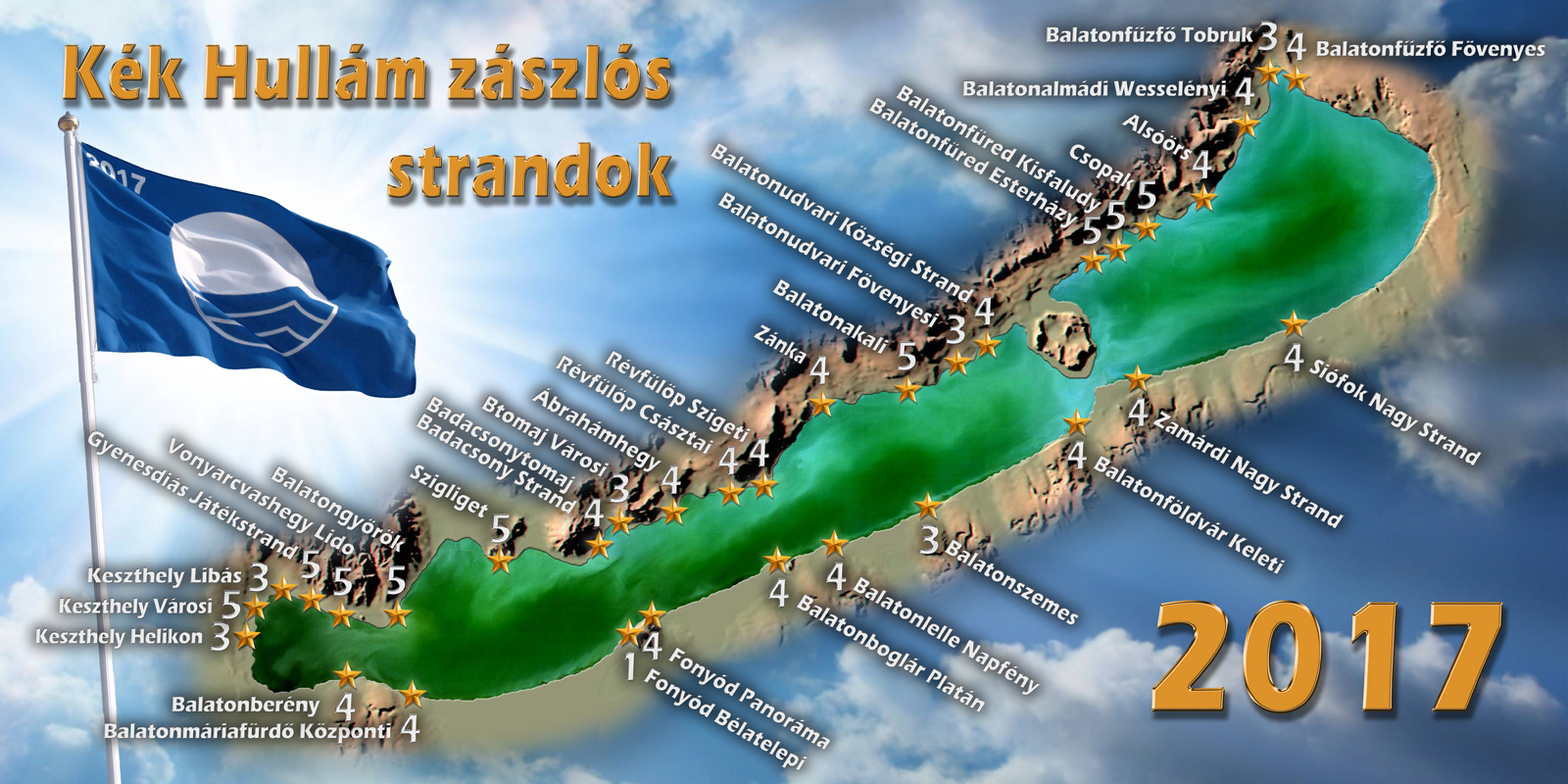 A Balatoni Szövetség 2017.-ben meghirdetett Kék Hullám Zászló strandminősítésére idén 33 strand nevezett. A helyszíni bejárások 2017 június 19.-22.-én zajlottak a hagyományosan bevont partnerek részvételével, a kerékpáros-barát szempontokat a Kerékpáros Magyarország Szövetség képviselői vizsgálták. Idén először egytől öt csillag szerepel a zászlókon, jelezve a szolgáltatások eltérő színvonalát az egyes strandokon. Tavasszal a Magyar Turisztikai Ügynökség pályázata segítségével sok strandon megindultak fejlesztések, ezek van ahol már be is fejeződtek, de van olyan strand, ahol még a munka elején tartanak. A befejezés határideje október vége, ezért a következő évben a balatoni strandok szolgáltatásának színvonalában további jelentős javulás várható.